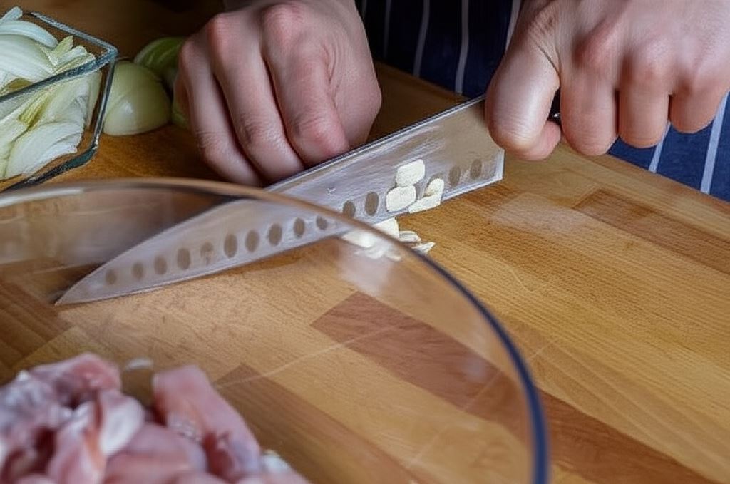 Kurczaka podziel na mniejsze kawałki. Białą część cebulki pokrój w piórka, a zielone części na 2 cm paski i odstaw na bok. Czosnek posiekaj w plasterki.