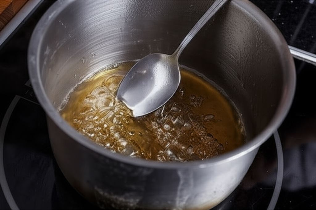 Cukier trzcinowy połącz z 50 ml wody i przelej do rondla. Rozpocznij gotowanie aż woda odparuje i cukier zacznie się karmelizować.