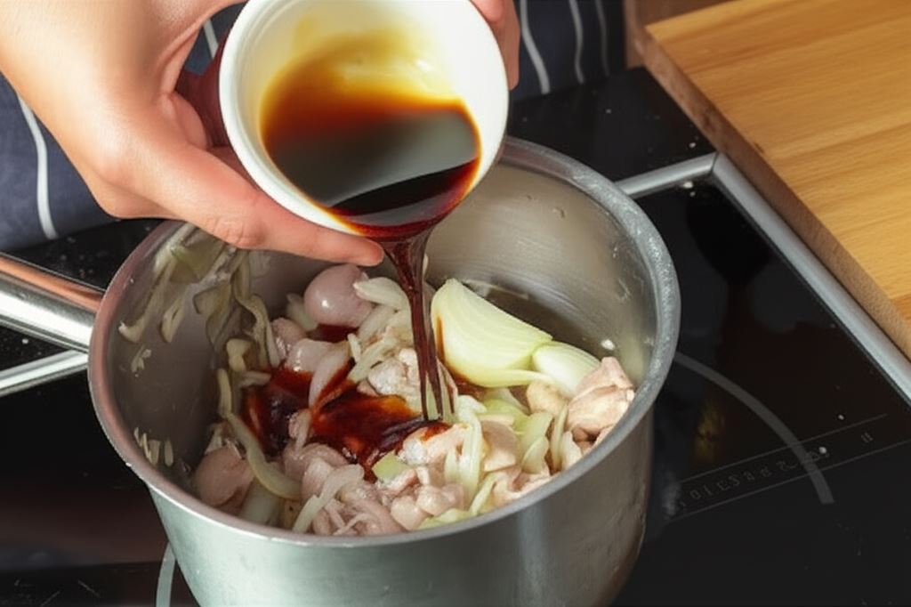 Wrzuć kawałki kurczaka, jasną cebulę i zaczekaj aż wszystko pokryje się karmelem. Potem wlej energicznie cały sos sojowy i dolej 100 ml wody.