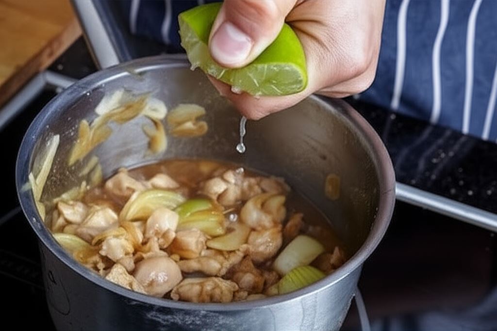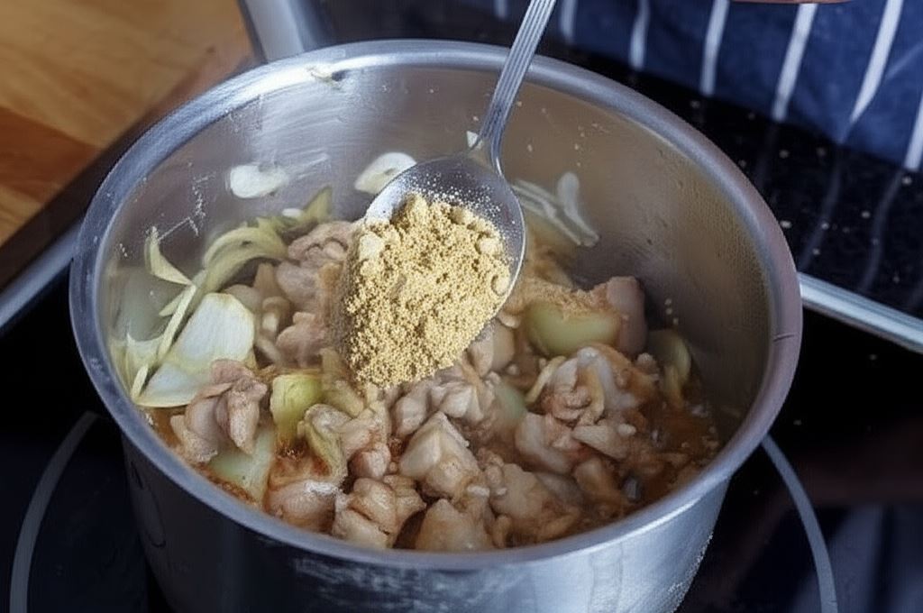 Dorzuć czosnek, Imbir Knorr i wszystko wolno duś dopóki sos nieco zgęstnieje a kurczak stanie się miękki.