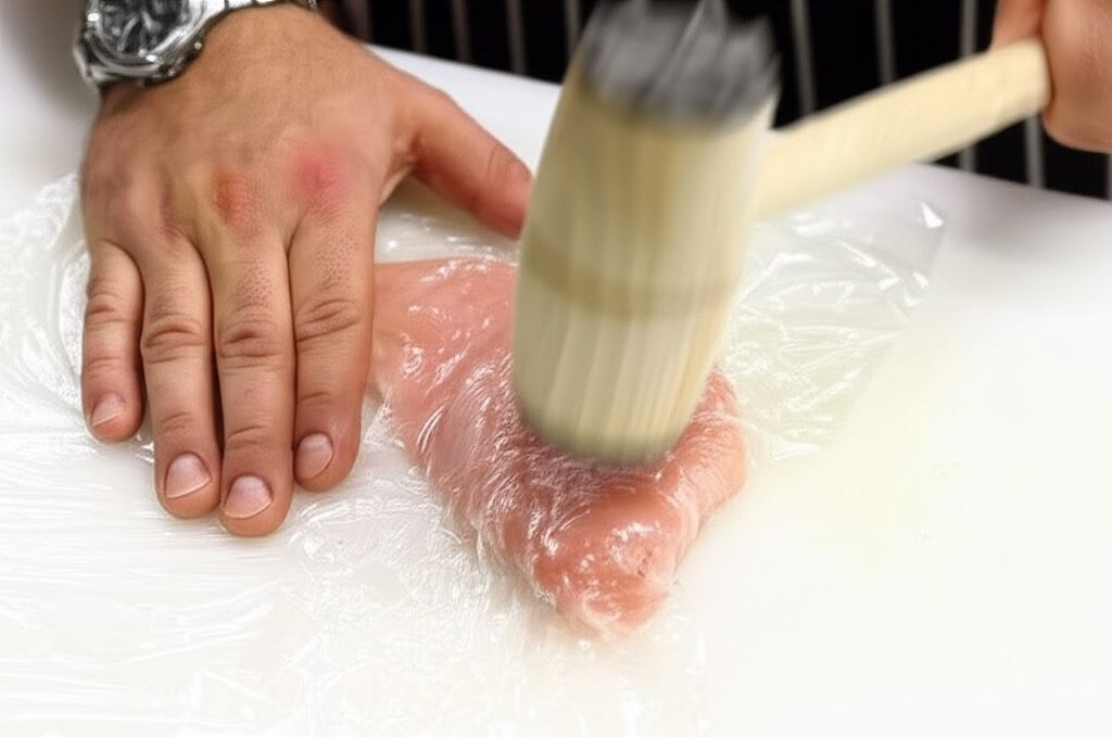 Mięso oczyść z błonek i tłuszczu. Potem tłuczkiem delikatnie rozbij do grubości około 2 cm.
