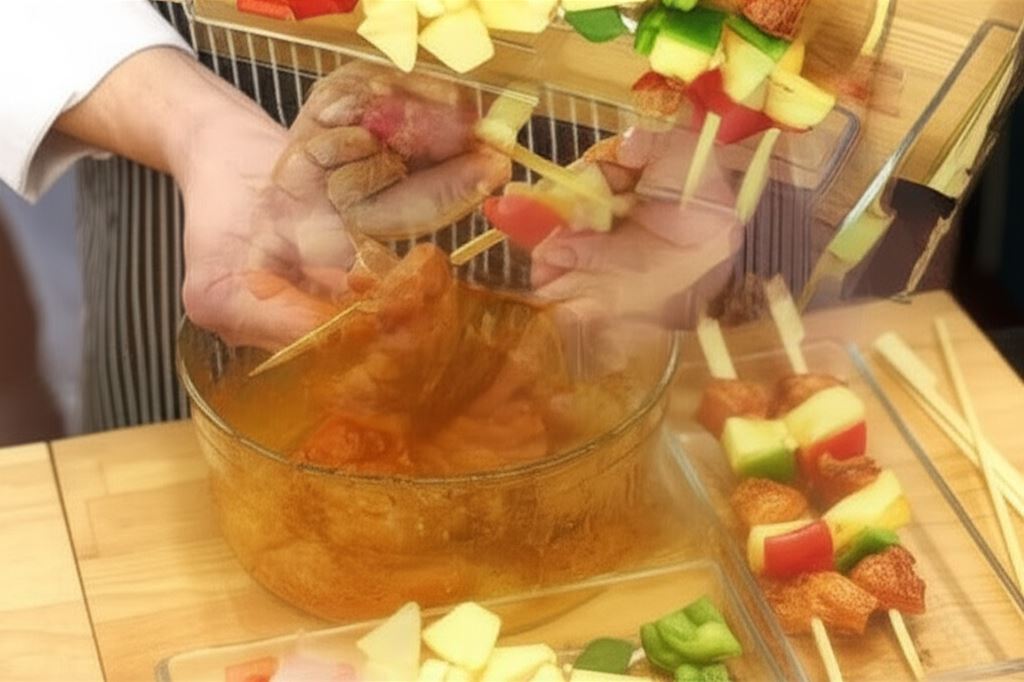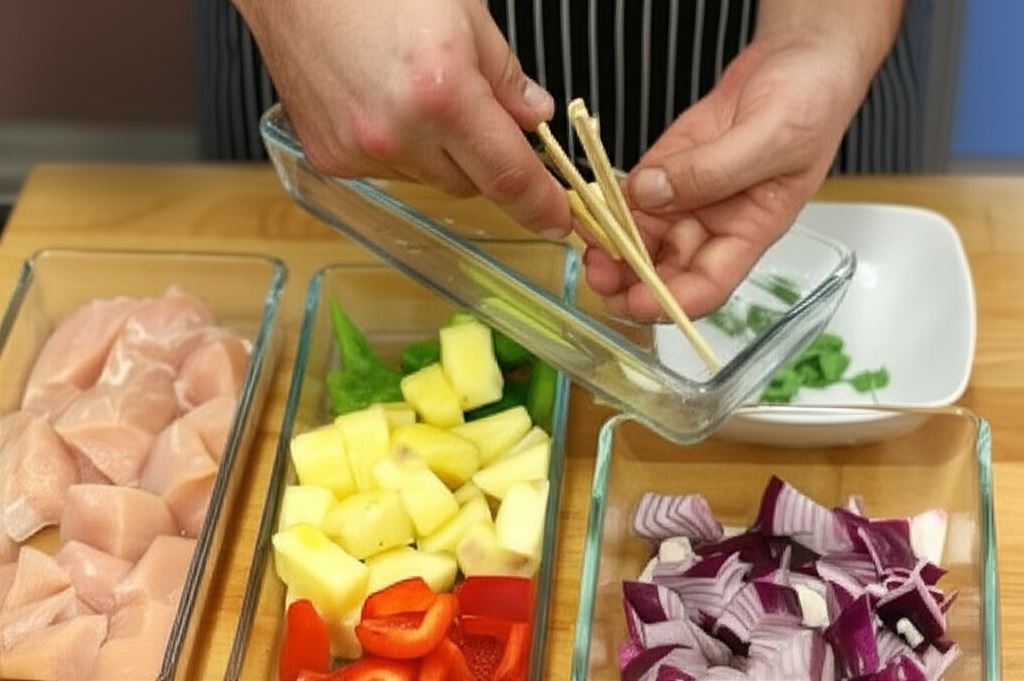 Po upływie tego czasu wszystkie składniki nadziewaj naprzemiennie na drewniane patyczki.