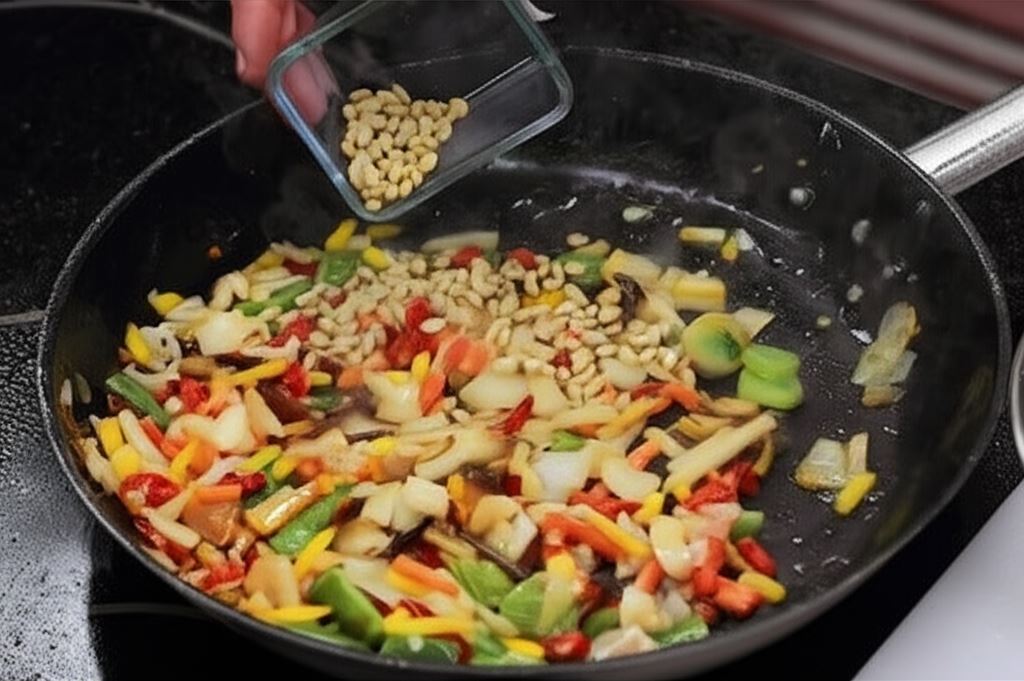 Warzywa i orzeszki podsmażaj osobno na silnym ogniu, nieustannie mieszając.