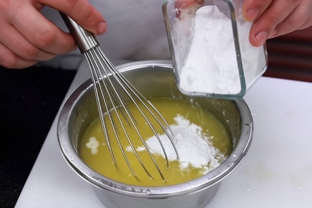 Poczekaj aż rosół z kury wystygnie i połącz go z łyżeczką mąki ziemniaczanej.