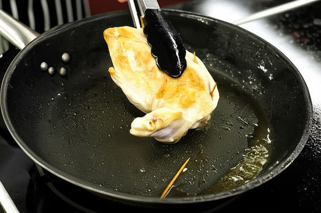 W rondlu lub na patelni podgrzej tłuszcz i przyrumień piersi z obu stron na złoty kolor. Podsmażone mięso odstaw na bok.