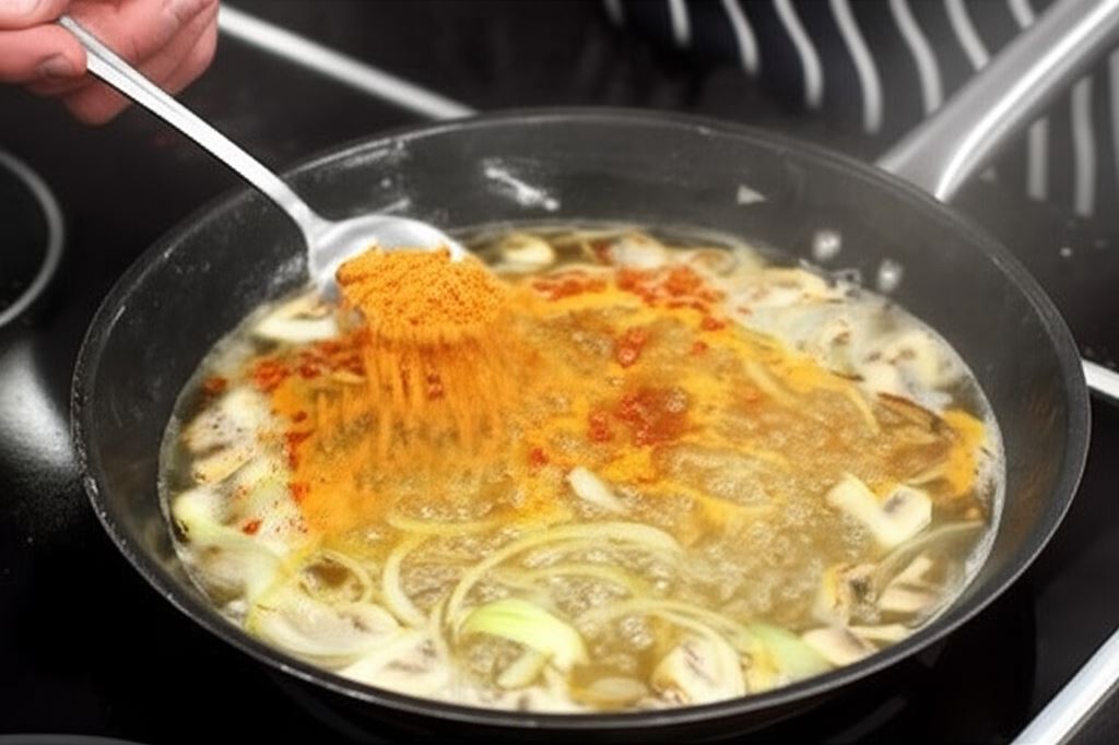 Cebulę posiekaj w piórka, pieczarki w 'ósemki'. Cebulę i pieczarki podsmaż na gorącym oleju w tym samym naczyniu. Dolej 500 ml wody i doprowadź do wrzenia. Aby potrawa była właściwie przyprawiona i odpowiednio gęsta dodaj Knorr Naturalnie Smaczne - Gulasz. Wszystko zamieszaj i zredukuj ogień.