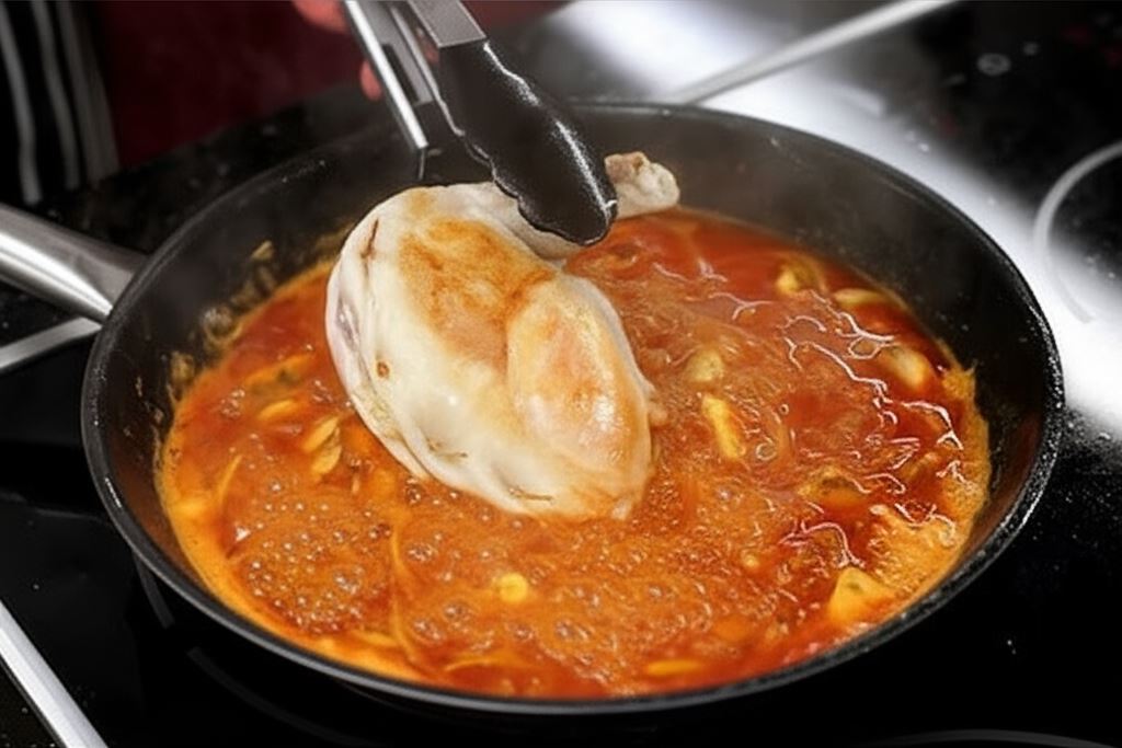Do bulgoczącego sosu włóż delikatnie przygotowane piersi i gotuj 25 minut. Ugotowane mięso serwuj z sałatą i chrupiącą bagietką.