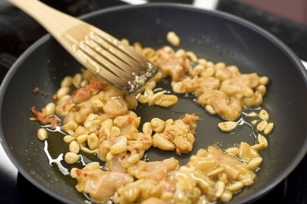 Podgrzej olej na patelni. Przez moment przesmażaj posiekane chili i orzechy, po czym dorzuć do tego kurczaka i smaż całość jeszcze przez parę minut.