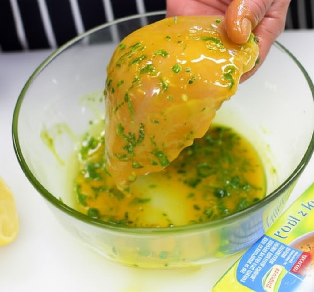 Piersi kurczaka opłucz, wysusz, pozbądź się żyłek i tłuszczu, a następnie włóż do przygotowanej marynaty. Mięso pozostaw na parę minut w zimnym miejscu.