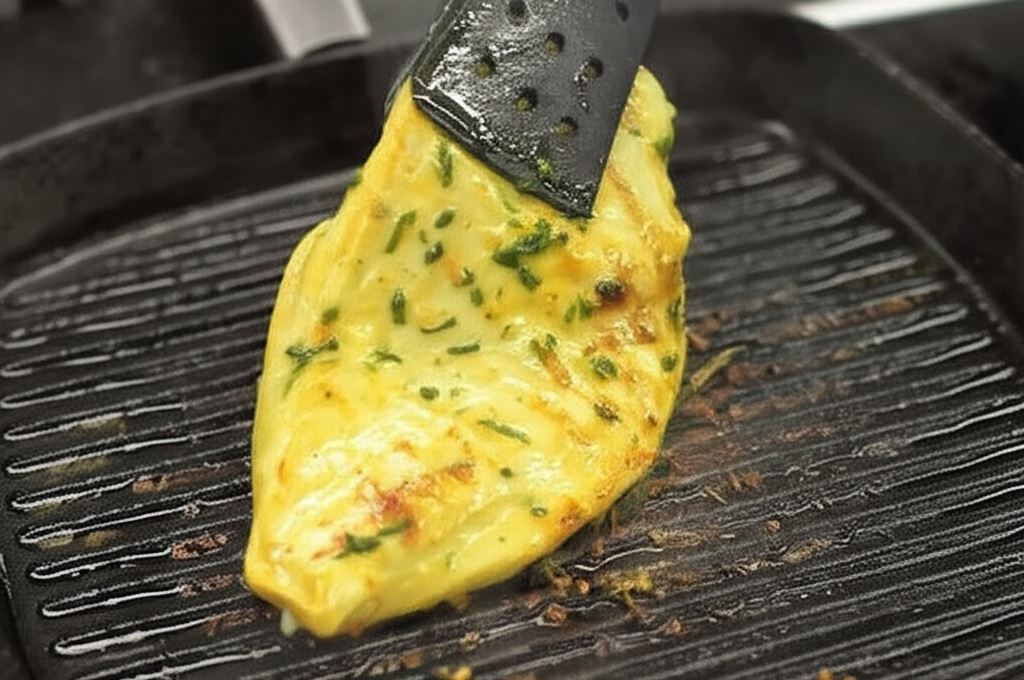 Smażyć pierś kurczaka przez 10-15 minut na średnio nagrzanej patelni grillowej, od czasu do czasu obracając mięso.