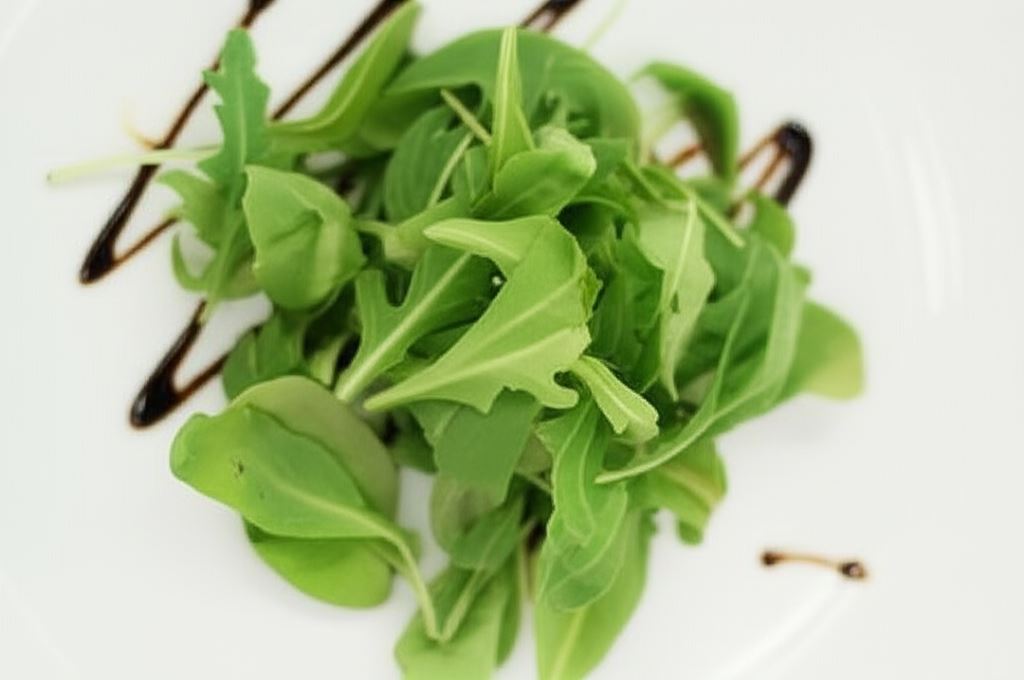 Na talerz wlej niewielką ilość kremu balsamicznego, umieść pośrodku garść rukoli i skrop ją delikatnie oliwą. Wyciśnij również odrobinę soku z cytryny.
