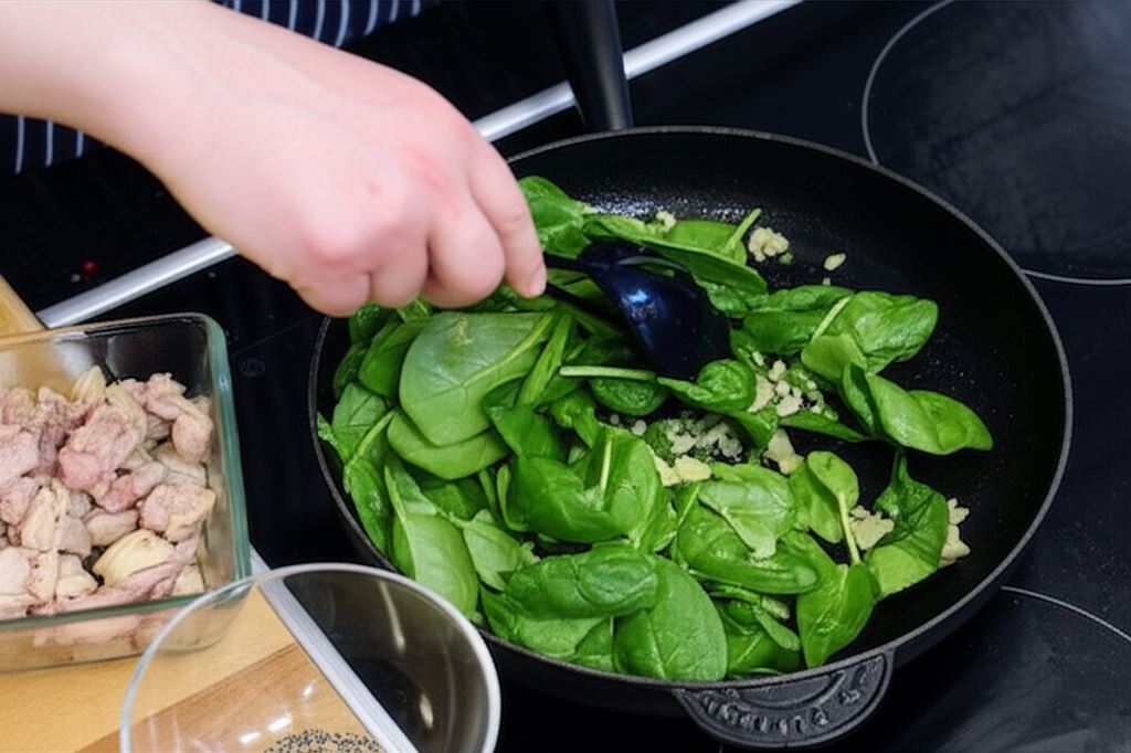 Na dwóch łyżkach oliwy podsmażaj mięso kurczaka, odłóż na bok. Na następnej porcji oliwy zrumień cebulę, czosnek, szpinak. Przypraw warzywa do smaku odrobiną pieprzu Knorr. Warzywa odłóż na bok.