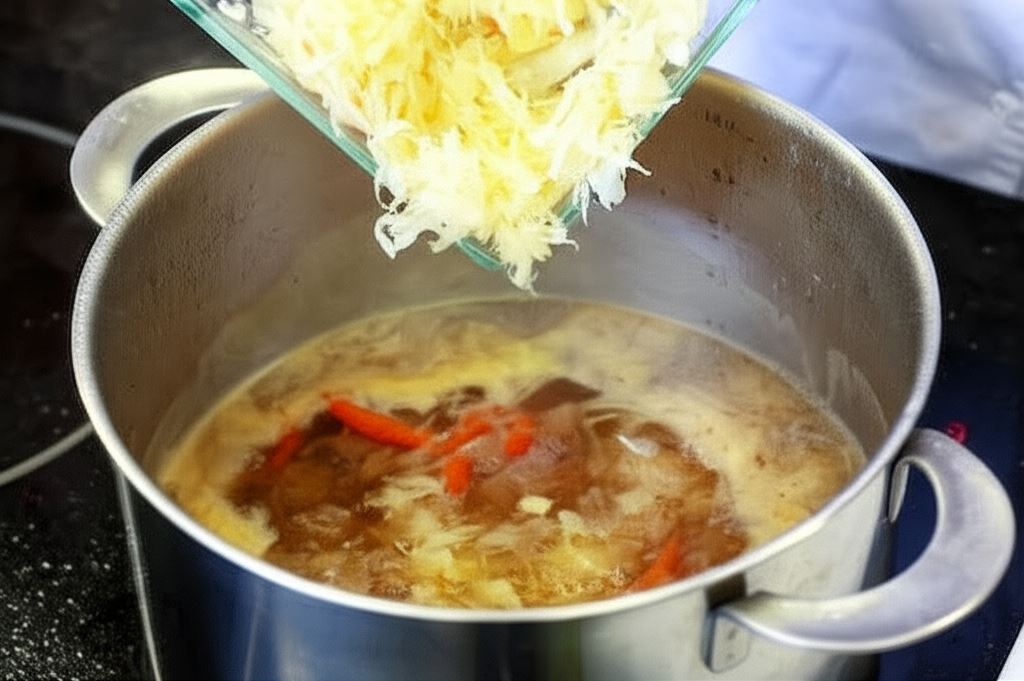 Poszatkuj kiszoną kapustę i wrzuć do zupy, duś przez następne 10 minut.