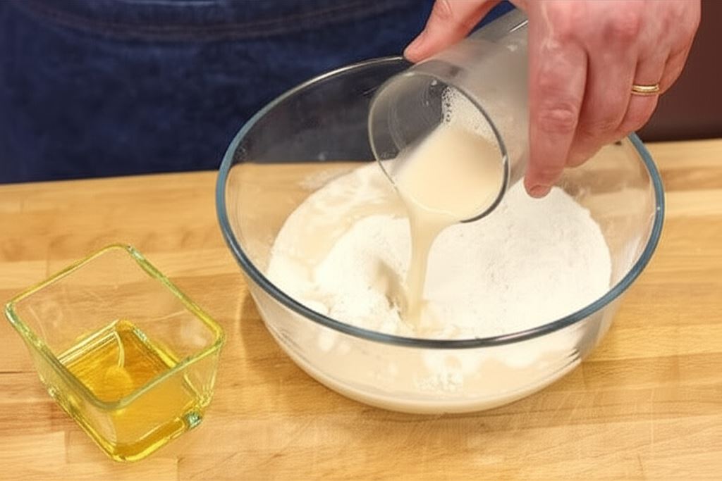 W 0,5 szklanki ciepłej wody (40°C) roztop drożdże i cukier. Szklankę nakryj ściereczką i odstaw na parę minut, aby zaczyn rozpoczął pracę. Mąkę przesiej na stolnicę, połącz ją z solą oraz z wciąż ciepłym zaczynem i olejem. Wszystko starannie wymieszaj.