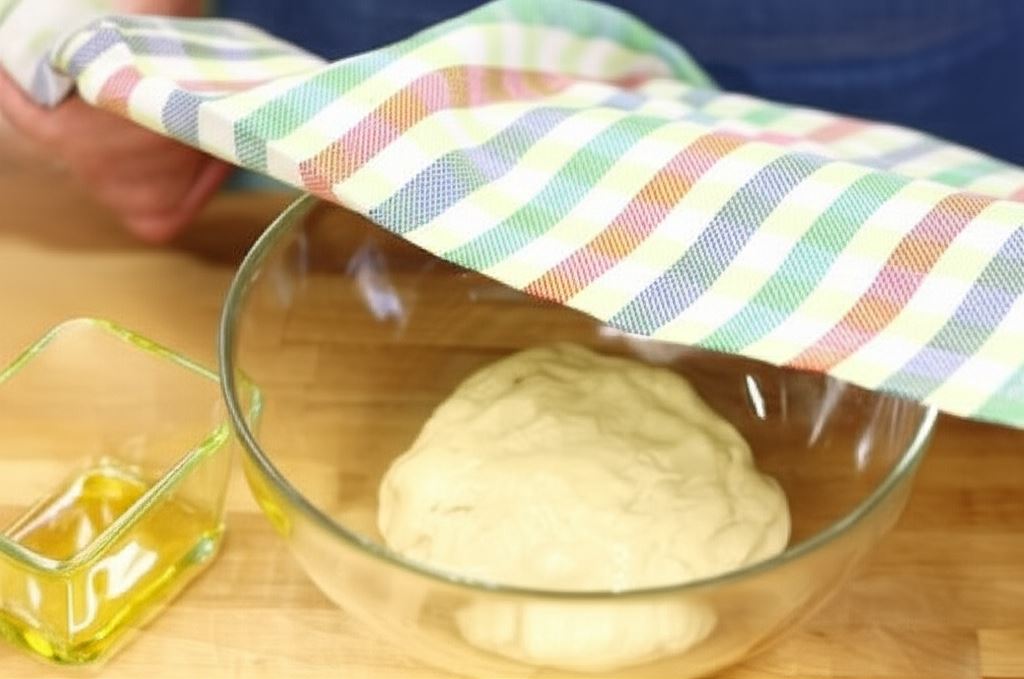 Wyrabiaj ciasto przez 5 do 10 minut, dopóki nie stanie się gładkie i elastyczne, w razie konieczności dosypując więcej mąki lub dolewając wody. Ciasto na końcu nie powinno być klejące. Włóż je do dużej miski delikatnie posmarowanej olejem. Obróć ciasto, aby całkowicie pokryło się olejem, także na wierzchu. Nakryj miskę ręcznikiem. Odstaw w ciepłe miejsce na około 1,5 do 2 godzin. W tym czasie przygotuj farsz.