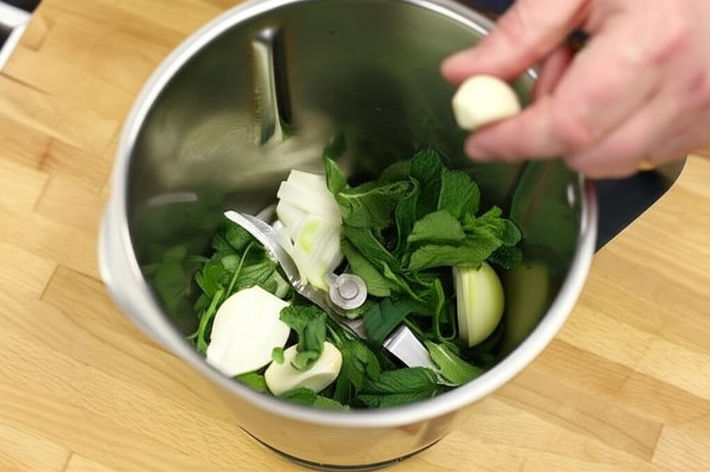 W naczyniu 'cutera' ręcznego umieść natkę pietruszki, chili, miętę, cebulę, czosnek, wszystko dokładnie posiekaj, po czym odciśnij, eliminując nadmiar soku.