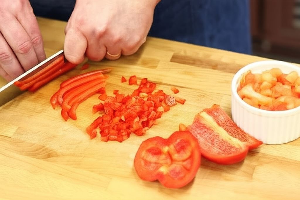 Na pomidorach wykonaj nacięcie nożem, włóż je na moment do wrzącej wody. Zdejmij z nich skórkę i nasiona, miąższ posiekaj w małą kosteczkę. Paprykę obierz i również pokrój w małą kostkę.