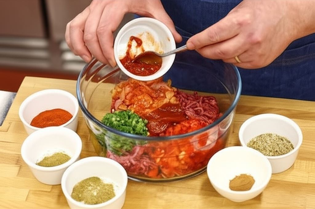 W naczyniu wymieszaj razem mięso, fix Knorr i zblendowane przyprawy, przecier pomidorowy, pastę paprykową, wsyp pomidory i paprykę, całość przypraw do smaku mieloną kolendrą, słodką papryką, kminem rzymskim, cynamonem i solą.