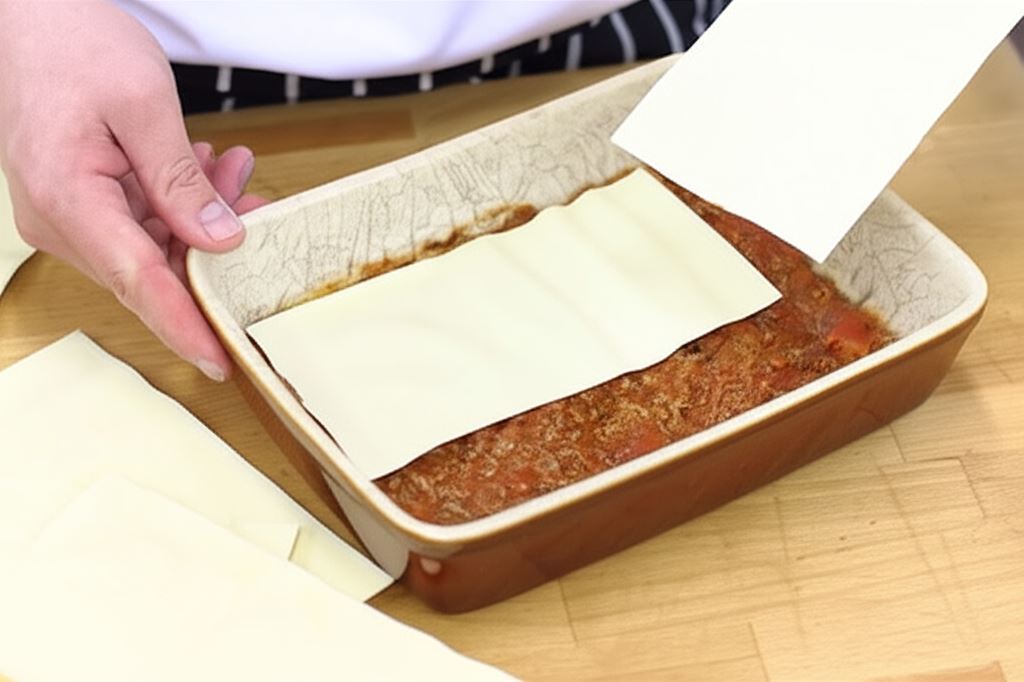 Umieszczaj w naczyniu do zapiekanek naprzemiennie sos i makaron lasagne. Zacznij i skończ warstwą sosu.