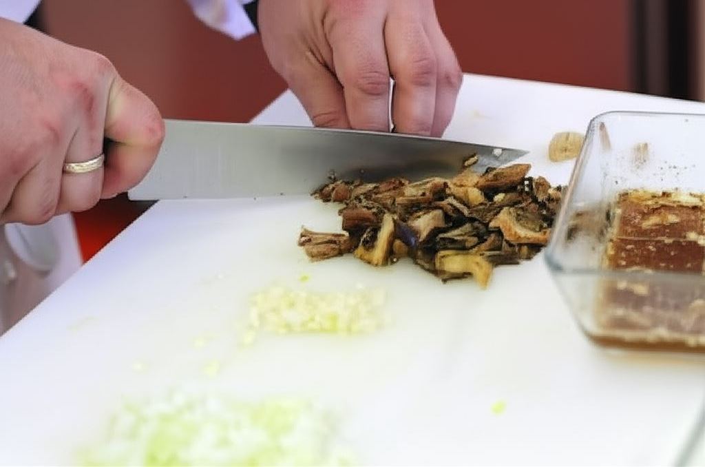 Dwa opakowania Fix Knorr połącz z 0,5 litrem wody i śmietaną. Gotuj przez kilka minut. Grzyby suszone zamocz w wodzie, potem pokrój w paski. Wywar odłóż. Cebulę i czosnek posiekaj drobno i zrumień na oliwie.