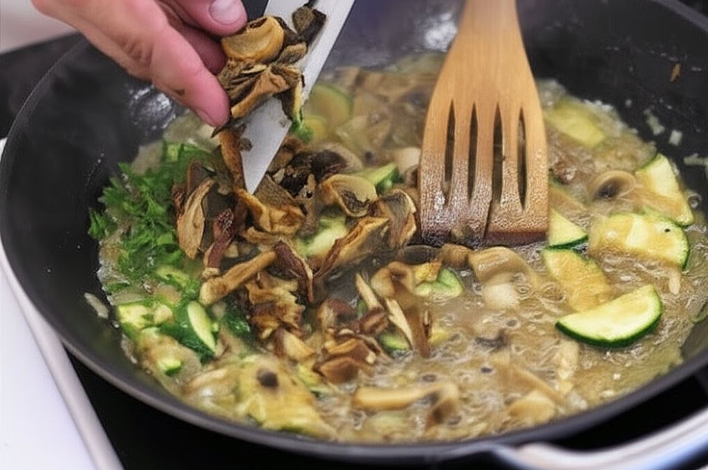 Pieczarki pokrój w ósemki, cukinię w półplastry. Podsmaż wraz z cebulą i zalej bulionem grzybowym - gotuj aż płyn odparuje. Wsyp posiekaną natkę, dodaj namoczone grzyby i przypraw według smaku.