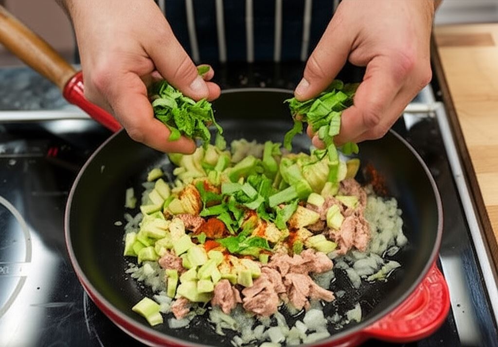 Na oliwie zrumień posiekaną cebulę, kiedy stanie się szklista odsuń patelnię z ognia i wsyp tuńczyka, pokrojone w kostkę awokado, posiekaną bazylie oraz szczyptę ostrej papryki. Wszystko dokładnie wymieszaj.