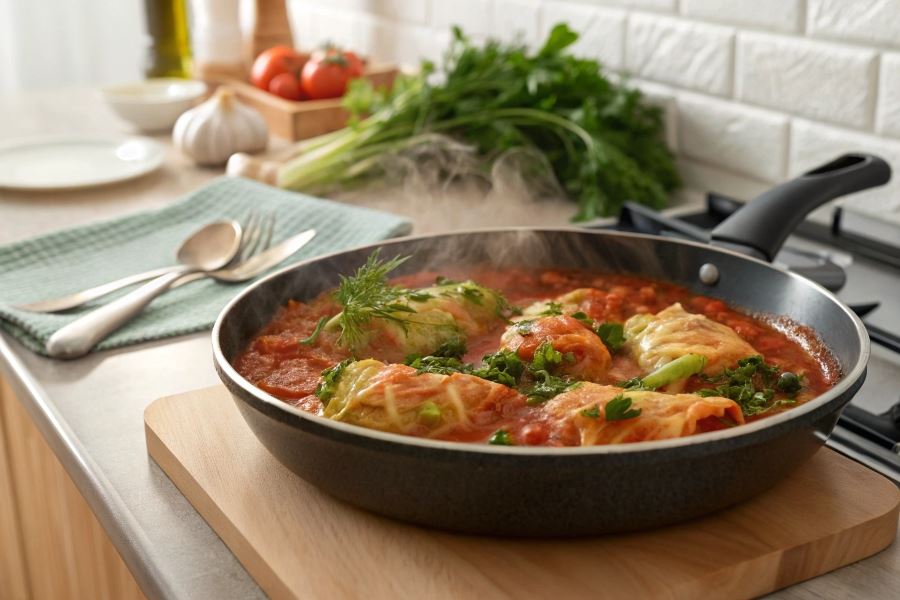 Przygotowanie leniwych gołąbków na patelni w śmietanie pomidorowej