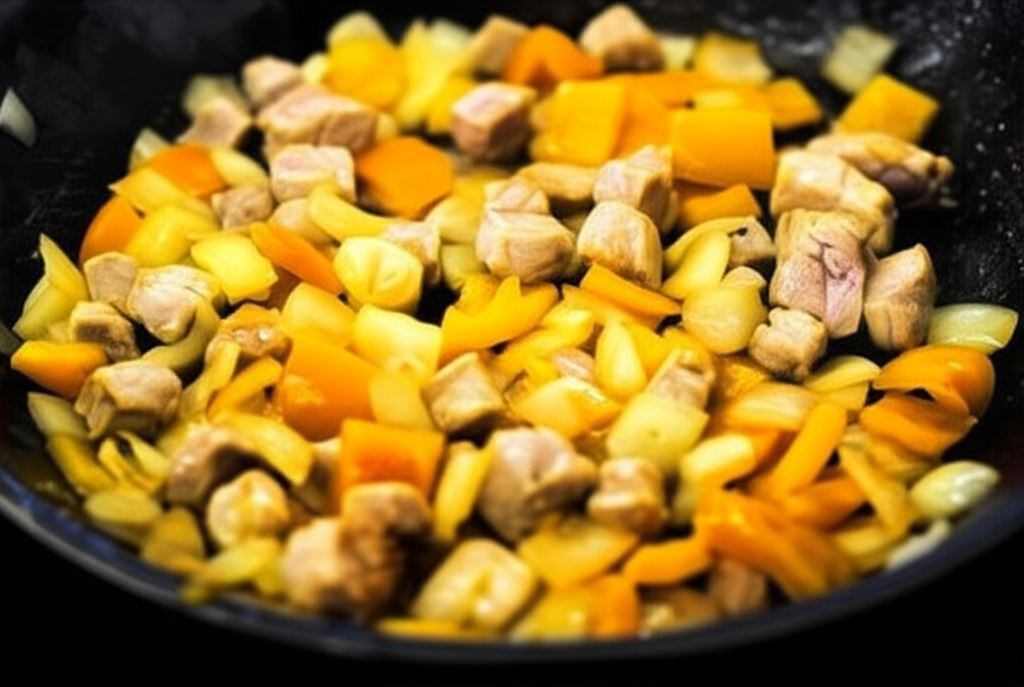 Podsmaż pokrojoną w kostkę wieprzowinę razem z posiekaną cebulą i papryką.