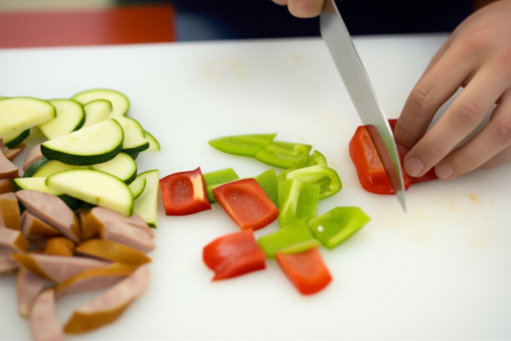 Pomidory oparz, zdejmij z nich skórkę i usuń nasiona. Kiełbasę oraz cukinię pokrój w grube półplastry. Papryki, cebulę oraz pomidory pokrój w dużą kostkę.
