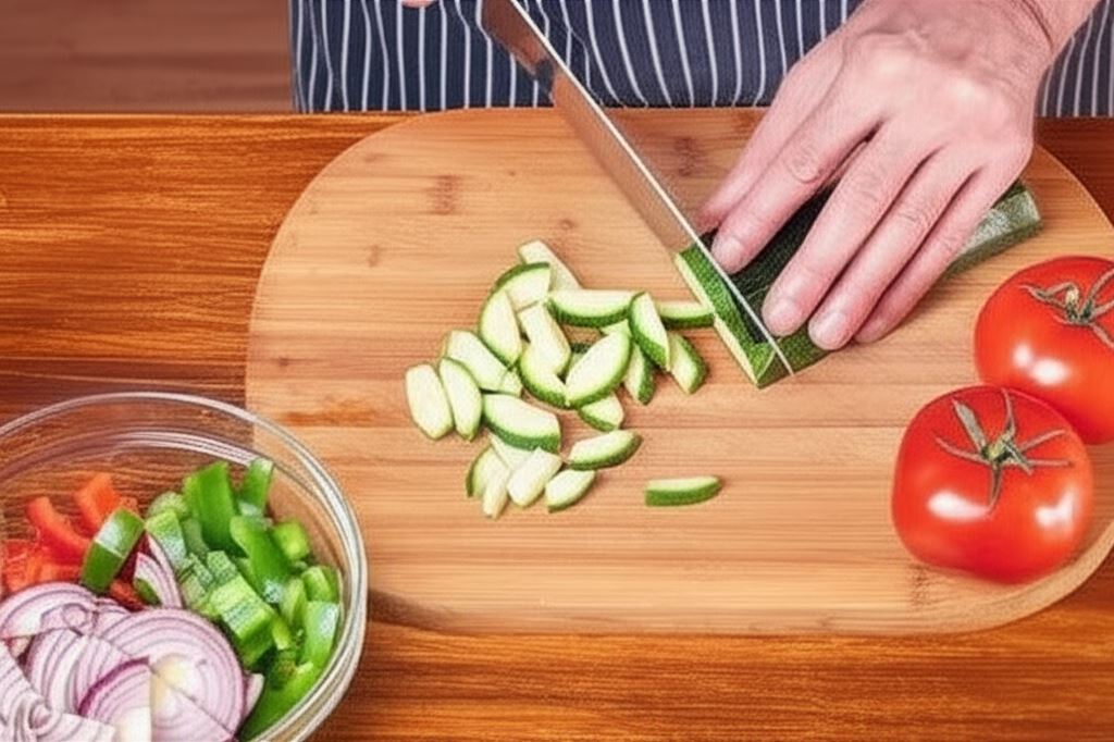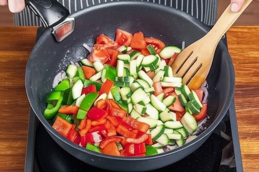 Papryki oczyść z nasion i pokrój w paski, cebulę w piórka. Cukinię przekrój wzdłuż na 4 części i usuń nasiona, potem pokrój w plastry, z pomidorów zdejmij skórkę i pokrój w kostkę.