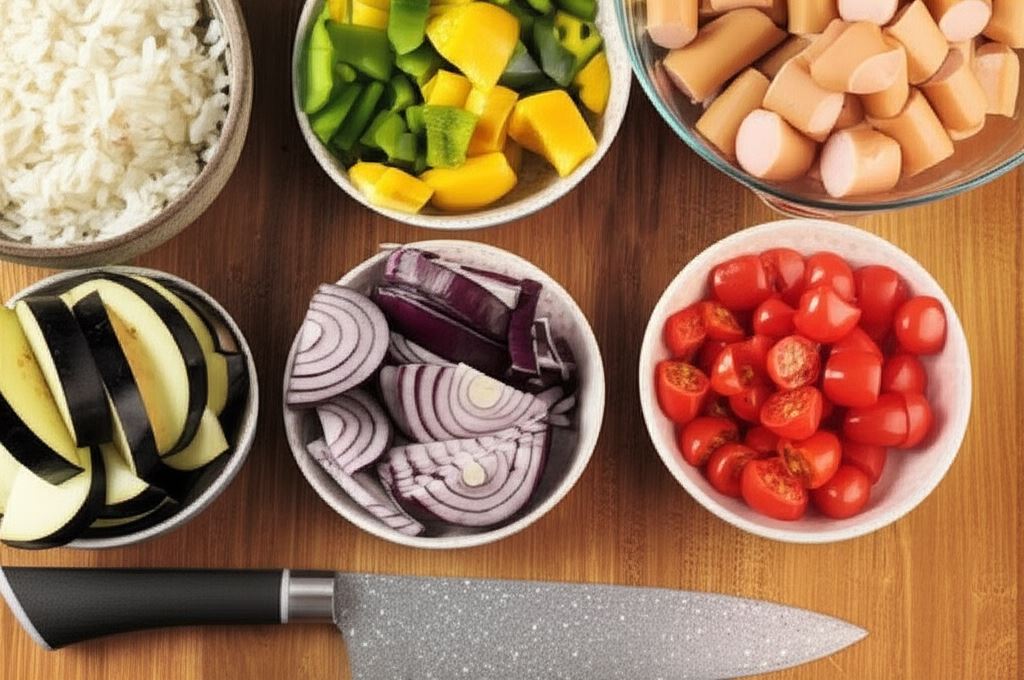 Recepturę na leczo z parówkami rozpocznij od siekania składników. Pokrój 400 gramów parówek na grubsze krążki. Przejdź do warzyw. 100 gramów pomidorków koktajlowych przetnij na połówki, żółtą paprykę posiekaj w kostkę, a bakłażana i dwie czerwone cebule – w półkrążki. Następnie zajmij się ryżem. Doprowadź wodę w garnku do wrzenia, dodaj do niej ryż i gotuj zgodnie z instrukcją, którą znajdziesz na opakowaniu.