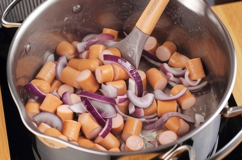 Przygotuj kolejny garnek, w którym sporządzisz właściwe danie. Na dnie rozgrzej 300 mililitrów oleju. Zrumień na nim posiekaną czerwoną cebulę oraz parówki.