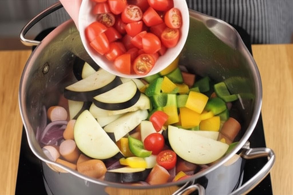 Gdy kawałki parówek i cebula już trochę się zrumienią, oznacza to, że nadszedł moment, aby wsypać do garnka resztę warzyw, czyli bakłażana, żółtą paprykę oraz pomidorki koktajlowe. Podsmaż wszystko przez parę minut.