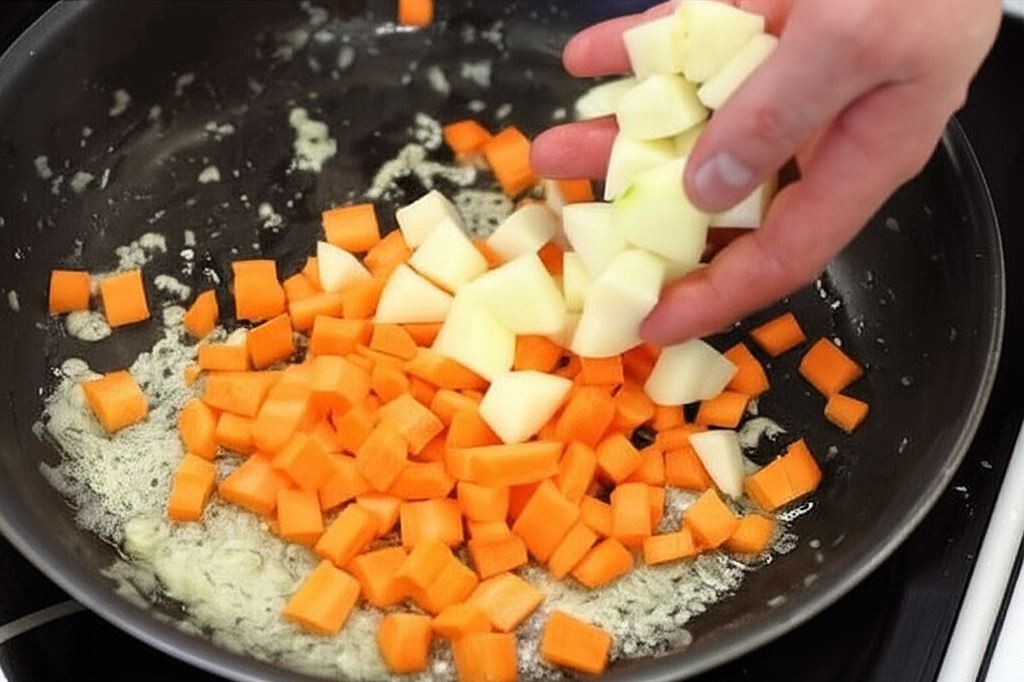 Na rozgrzanej oliwie zeszklij cebulę, wsyp ziemniaki i marchewkę. Podsmaż.