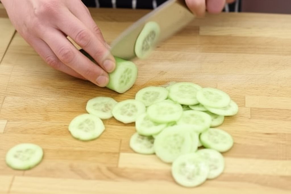 Ogórki starannie wymyj, obierz ze skórki i pokrój na plasterki.