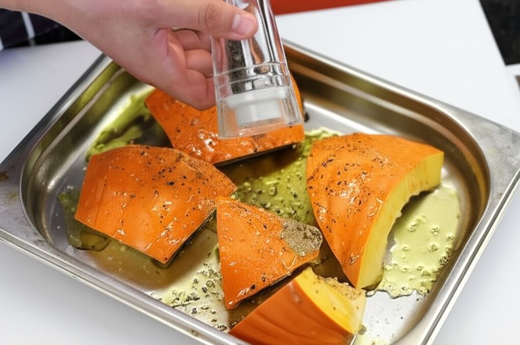 Dynię posmaruj oliwą z oliwek, oprósz solą morską i czarnym pieprzem. Przygotowaną w ten sposób piecz w 200 °C przez 30 minut.