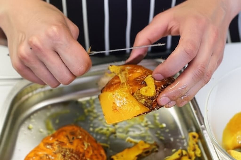 Po wypieczeniu, kiedy dynia nieco przestygnie, zdejmij z niej skórkę i usuń pestki.