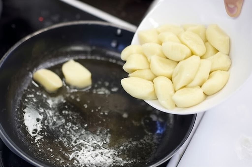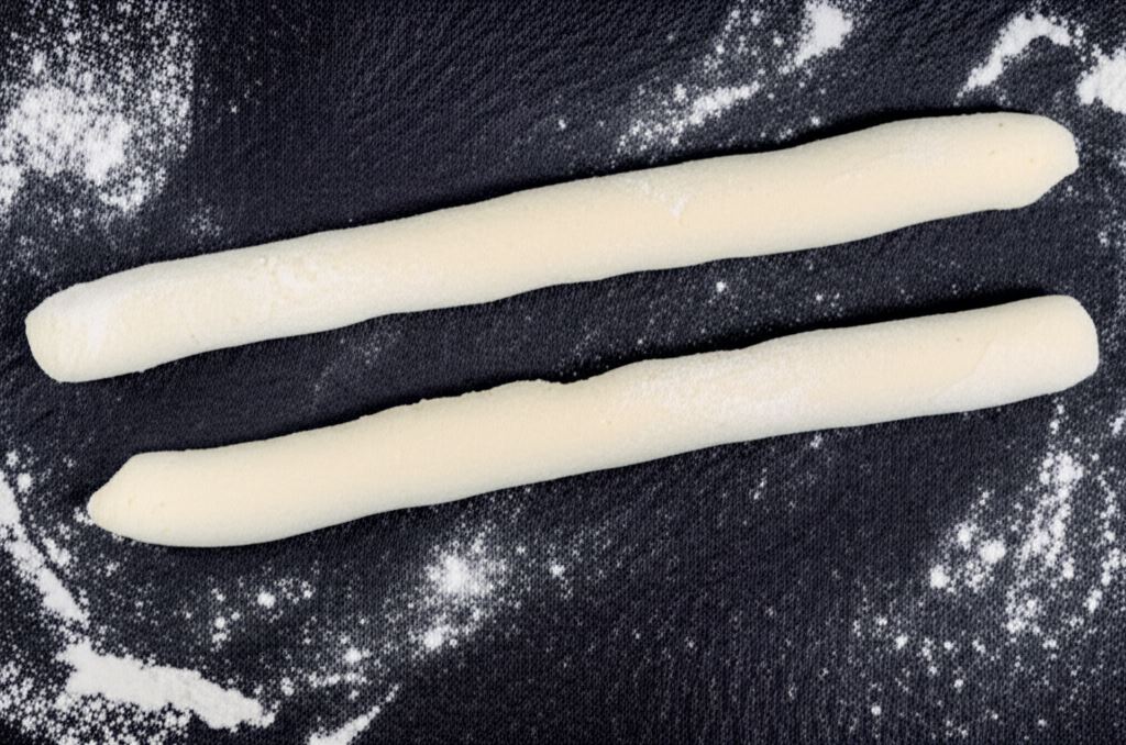 Twaróg, przepuszczony przez praskę, połącz szybko i energicznie z żółtkiem, serkiem homogenizowanym, mąką ziemniaczaną oraz pszenną i cukrem waniliowym formując zwarte ciasto. Odstaw ciasto na 10 minut. Potem oprósz lekko mąką, podziel ciasto na mniejsze części i z każdej uformuj wałek. Jeśli ciasto okaże się zbyt rzadkie dodaj trochę więcej mąki.