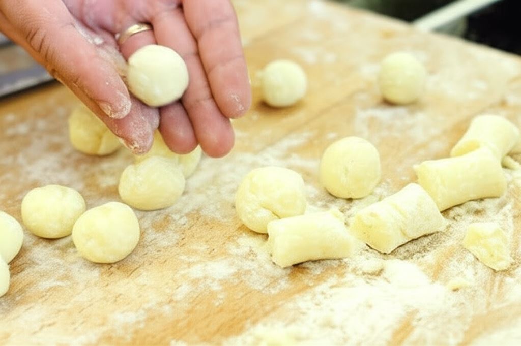 Twaróg, przepuszczony przez praskę, zmieszaj szybko i energicznie z jajkiem, skrobią ziemniaczaną oraz mąką pszenną i cukrem waniliowym formując zwarte ciasto. Odstaw na 10 minut. Potem oprósz lekko mąką, podziel ciasto na mniejsze porcje i z każdej uformuj wałeczek.