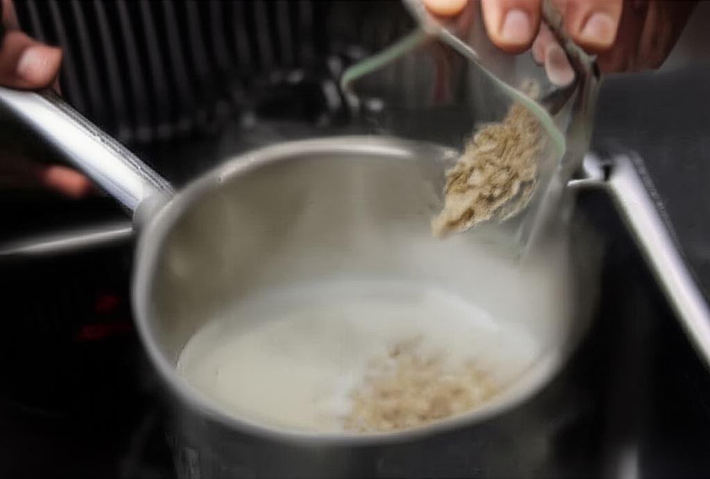 Doprowadź mleko do wrzenia i wsyp do niego płatki, potem gotuj przez około 5 minut.