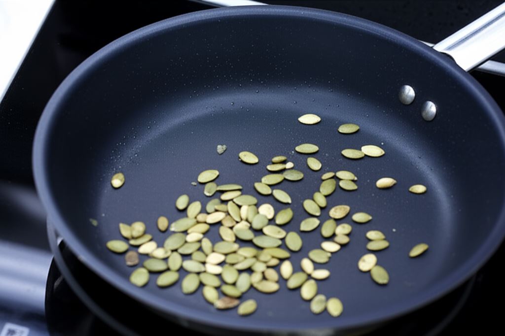 Nasiona dyni podpraż na suchej patelni, pilnując, aby się nie przypaliły.