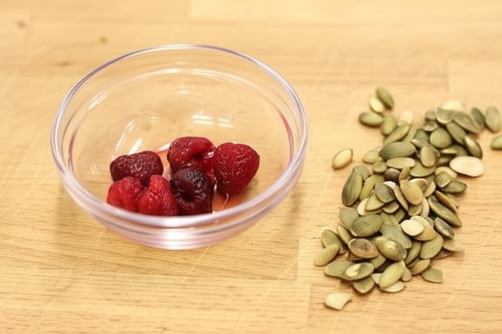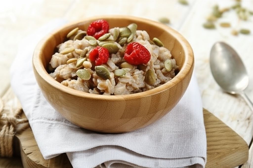 Letnia owsianka z malinami i prażonymi pestkami dyni