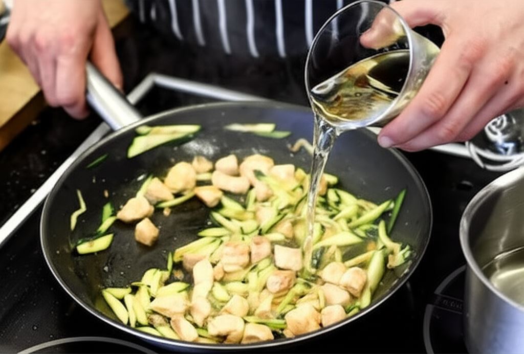 Całość zalej winem, po czym gotuj pod przykryciem przez około 3 minuty. Następnie dodaj makaron.