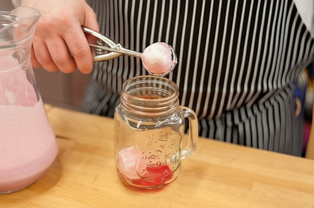 Na spód szklanki włóż dwie kulki lodów truskawkowych.
