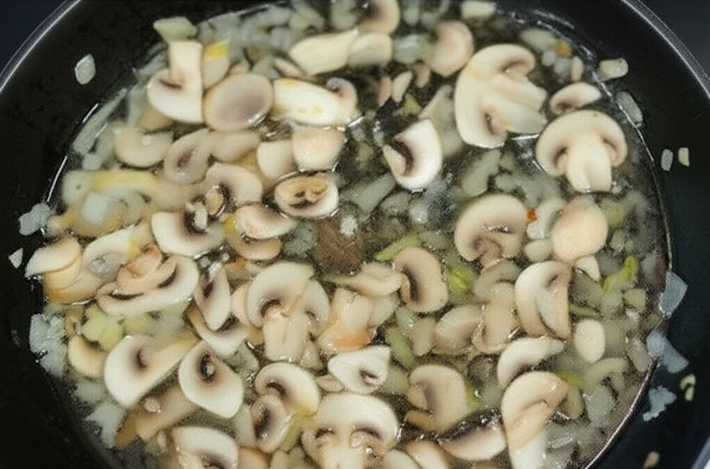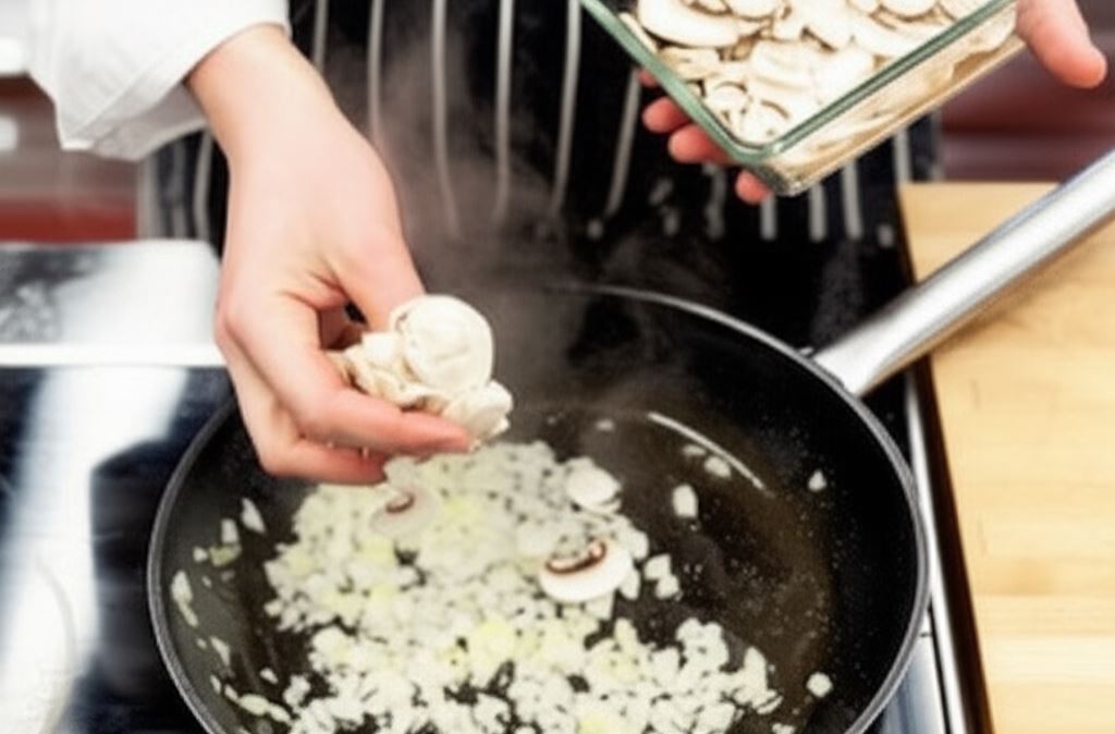 Posiekaj cebulę w kostkę, grzyby w plastry. Smaż na tej samej patelni co uprzednio warzywa, na gorącym oleju przez minutę.