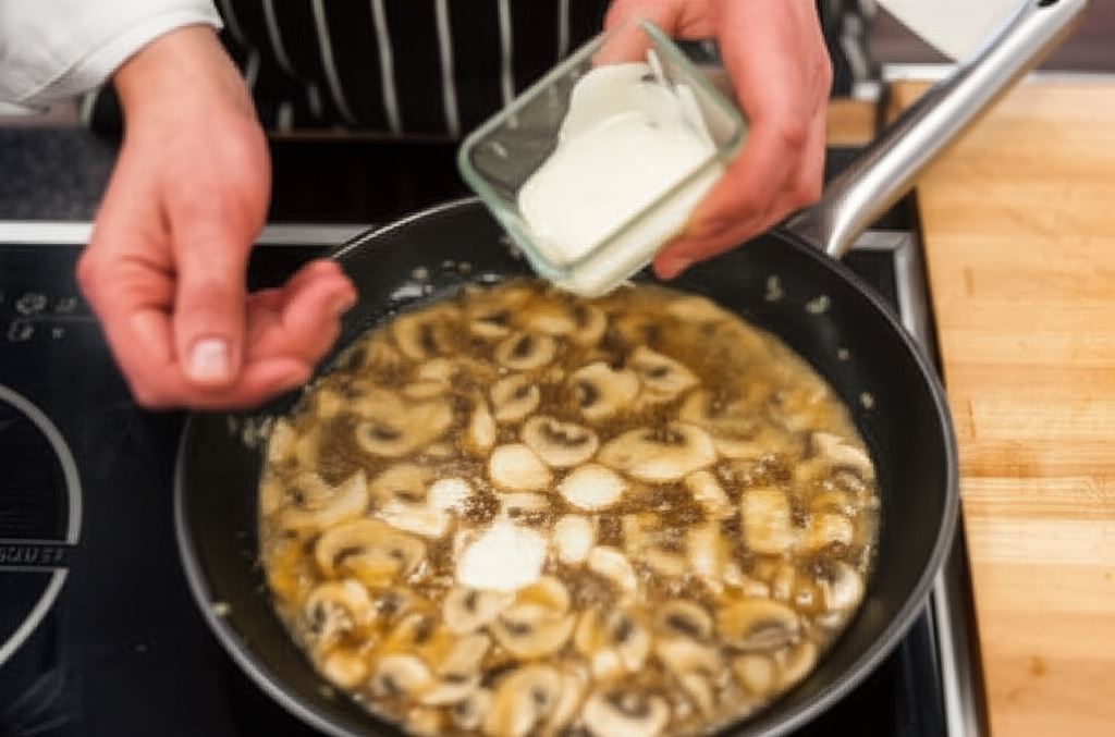 Usuń patelnię z ognia, dolej 200 ml zimnej wody, wsyp Sos do pieczeni jasny Knorr, dzięki któremu sos nabierze gęstości i będzie właściwie przyprawiony. Wszystko starannie zamieszaj, aby upewnić się, że esencja całkowicie się rozpuściła.