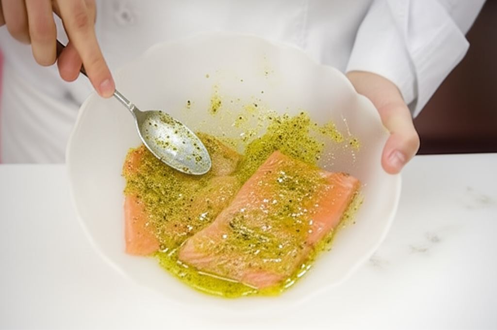 Wymieszaj przyprawę Knorr z 2 łyżkami oliwy. Potem filety łososiowe posmaruj marynatą i odłóż do lodówki na 30 minut.