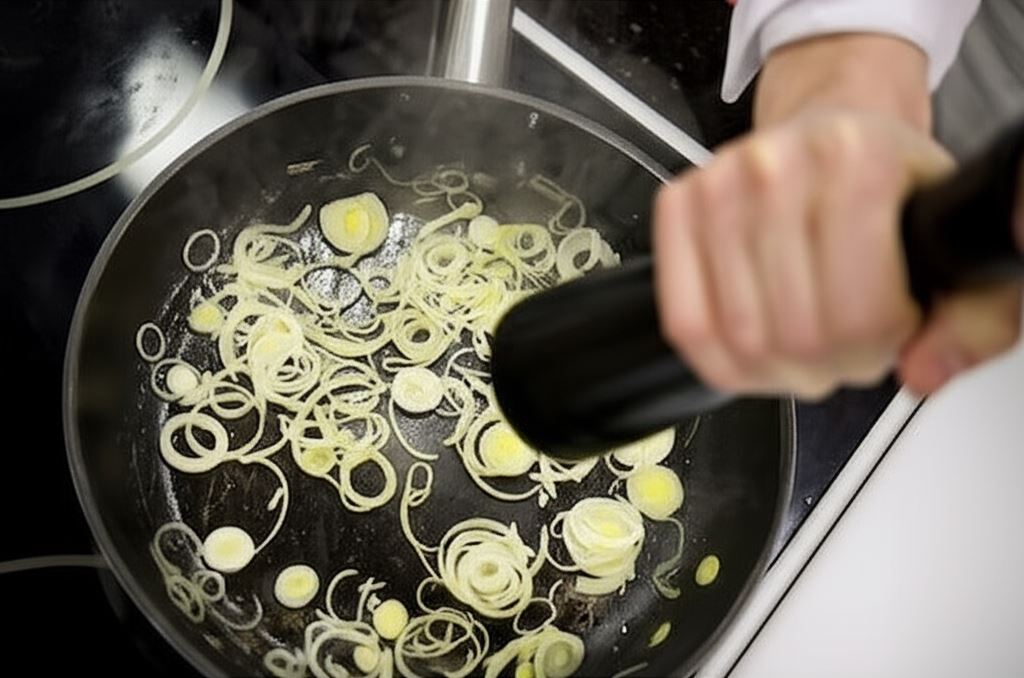 Białe części pora pokrój w cienkie krążki i przysmaż na oliwie, po czym dopraw odrobiną soli i pieprzem.
