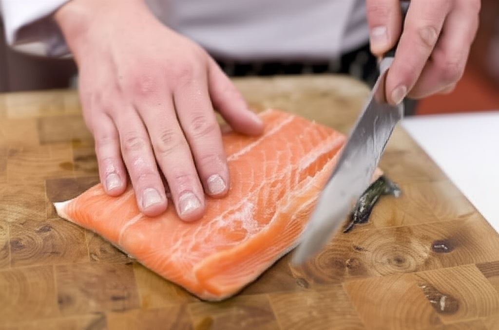 Filet łososiowy oczyść z ości i łusek, zachowując skórę. Odetnij brzuszną część ryby. Pozostały filet podziel na prostokątne kawałki, każdy około 80 gramów.