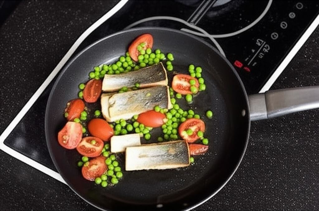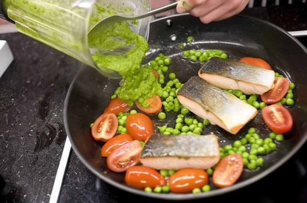 Obsmaż na patelni kawałki ryby z obu stron. Potem dodaj pomidorki cherry przecięte na połówki i zielony groszek.
